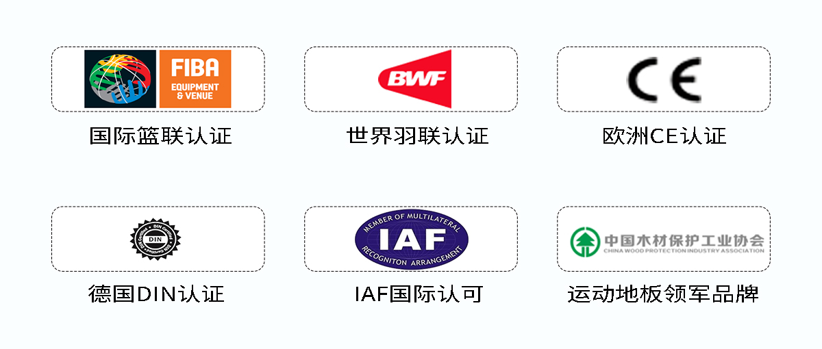暢森體育運(yùn)動木地板通過了國際籃聯(lián)(FIBA)、世界羽聯(lián)(BWF)、歐盟認(rèn)證(CE)、德國標(biāo)準(zhǔn)DIN、歐洲標(biāo)準(zhǔn)EN五大國際標(biāo)準(zhǔn)認(rèn)證。暢森體育案例遍布全球80多個國家和地區(qū),為全球10000余個運(yùn)動場館提供一站式的整體解決方案,受到國內(nèi)外專業(yè)場館用戶的認(rèn)可與青睞!