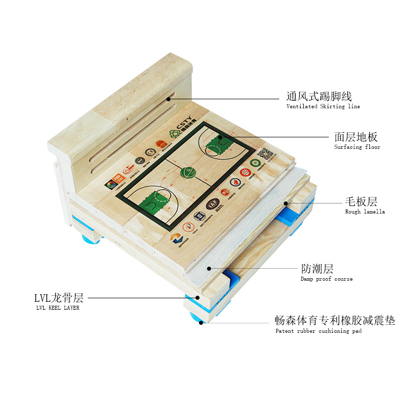 這是一種全縱向層疊式抗變形懸浮式結構,它不但堅固耐用而且彈性十足, LVL龍骨經過高溫高壓處理,在每層單板之間有環保膠封閉,能長期起到防腐作用,且大大提高了木龍骨的彈性、韌性,抗彎性能。運動性能完全滿足DIN標準的要求。