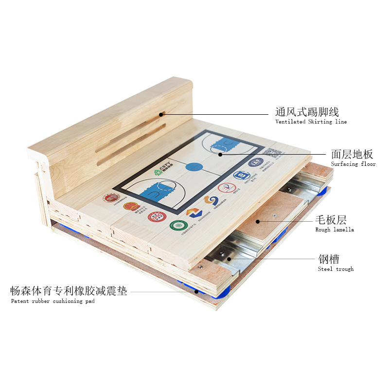 這是一套固定與懸浮相結(jié)合的運動地板系統(tǒng),鋼槽可以將上下兩層毛板有效分隔,同時將底層毛板緊緊地壓在地基上,可以防止運動木地板的大面積橫向或縱向收縮。整體結(jié)構(gòu)強度大,承重能力遠(yuǎn)遠(yuǎn)大于實木龍骨,利用鋼槽幾字型結(jié)構(gòu),彈性強,將運動地板的運動性能、承載性能、環(huán)境適應(yīng)能力的表現(xiàn)提升到了一個全新的高度。