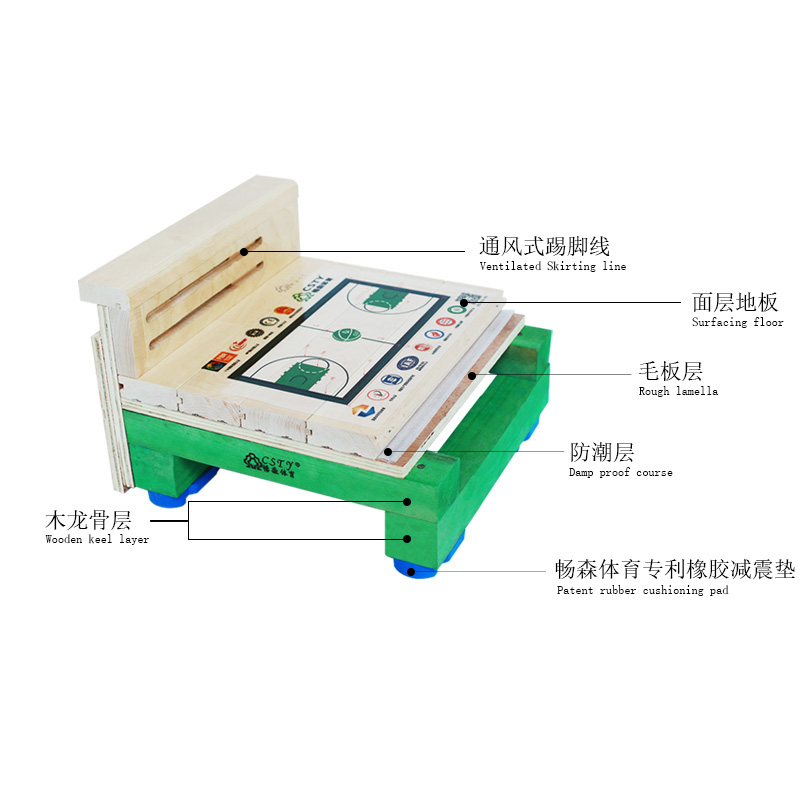 雙層龍骨結(jié)構(gòu)在毛地板與彈性墊之間增加了一層龍骨,運(yùn)動(dòng)木地板標(biāo)高增加,加大了毛地板與地面之間的距離,使運(yùn)動(dòng)木地板底層結(jié)構(gòu)通風(fēng)性及防潮功能好。在上下龍骨的交點(diǎn)之間加一個(gè)彈性墊,既保證系統(tǒng)結(jié)構(gòu)的的高穩(wěn)定性,避免龍骨直接接觸容易產(chǎn)生響聲,又能保證龍骨間垂直相互運(yùn)動(dòng),提供充足的彈性,提高運(yùn)動(dòng)性能。